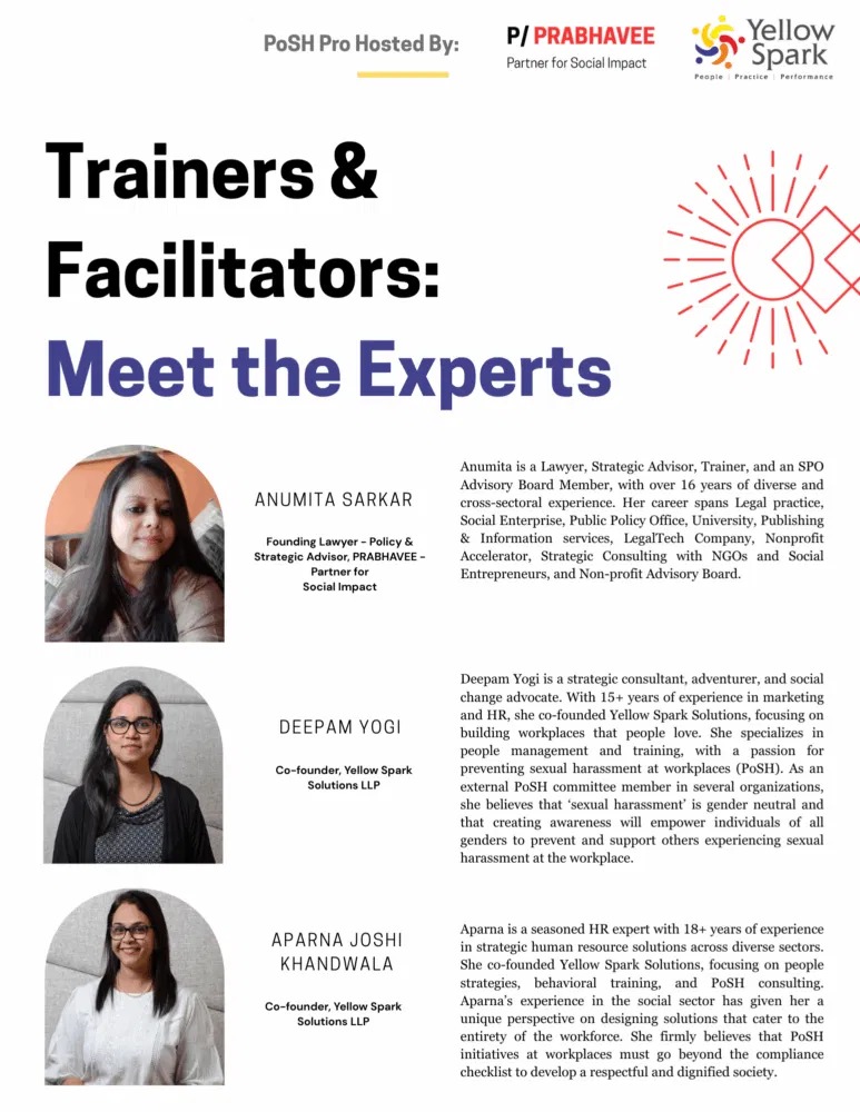 Pravbhavee – Partner for Social Impact, in collaboration with Yellow Spark – Strategic HR Consultants, is organising PoSH Pro – a two-day online workshop on the Prevention of Sexual Harassment (PoSH) at the Workplace. This event aims to enhance awareness and build capacity on PoSH.